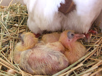 Except last Thursday. I went out with my warmed up fake eggs. (The real ones are toasty, hot-toddy warm and warming the fakes is less insulting to the pij.) I knew I had to pull them from Walter & Rocky, Art & Gus and Santino & Charlie Brown White Socks. I started with Santino and when I stuck my hand (holding a pair of fake eggs) underneath him to trade for the real, I was shocked to see and feel BABIES rather than eggs. I would have sworn in a court of law that those eggs were less than a week old (max) but it takes two and a half weeks to hatch a clutch so obviously I had screwed up. The scary thing is, if they hadn't have hatched the day before, I'd have pulled and thrown out chicks-about-to-hatch. Thank goodness I didn't do that.